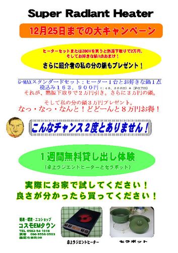 25日までのあと6日間。 奇跡の遠赤外線調理器。スーパーラジエントヒーターにお鍋おまけセール。 141,000円で卓上ラジエントヒーターとお鍋セットが買えて、さらにメーカーからお鍋もう1つプレゼント。そして私の紹介料でつくお鍋もプレゼントし…