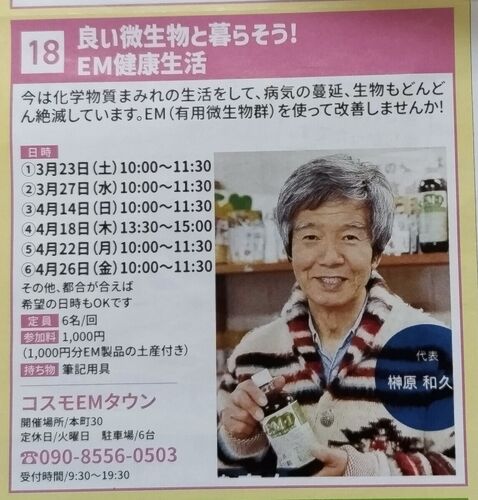 もう始まってますが、恒例のふれあい教室の案内です。 私の所は相変わらずEMと健康生活を交ぜた私の体験からの健康生活の提案です。 まだ余裕で席が空いています。 興味のある方は気楽にお申し込みください。